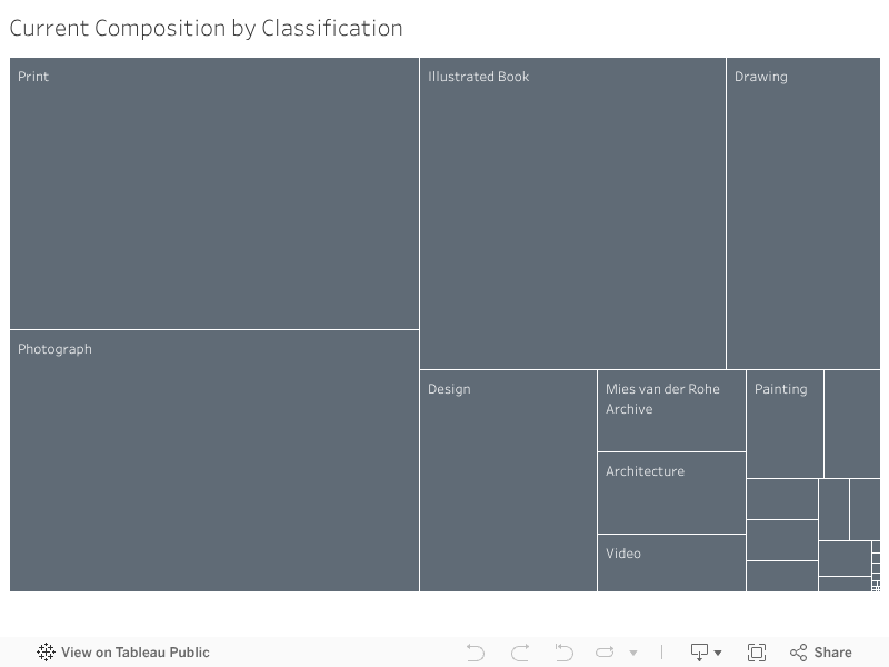 The bar chart above represents the number of acquisitions by department through time. Once again, 1964 and 1968 stand out as years in which sizeable amounts of acquisitions took place, but as opposed to the visualization presented in the departments section, this chart shows what types of objects were acquired – illustrated books and photographs respectively.